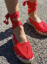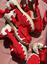 Es Para Ta’s Cintas Pla Vermell is the flat version of their signature style rendered in a vibrant shade of red. The silhouette is based on a traditional Catalan espadrille. Rich red Japanese ribbons tie around the ankles securely.