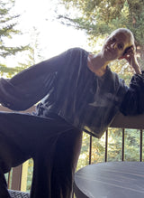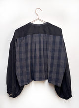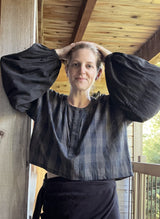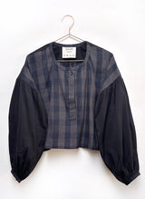 An update to the previous Maya top, slightly cropped shirt with a center front placket featuring voluminous sleeves, and a drop armhole. A combination of easy-going with some drama.