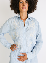 The perfect button-down does exist. Easy to dress up or down, this unisex shirt was designed to wear all day, every day. Structured yet relaxed, it features a collared neckline, edge stitching, and a front patch pocket. In a chic indigo colorway, handloom woven from naturally dyed organic cotton and hand-embroidered with naturally dyed yarn.