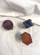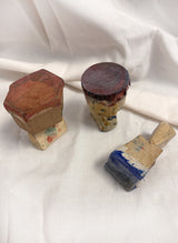 group of 3 hand carved printing blocks in various shapes, each shape around 1.5-2"