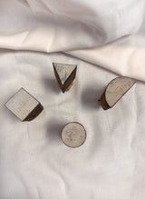 group of 4 hand carved printing blocks in various shapes, each shape around 1"
