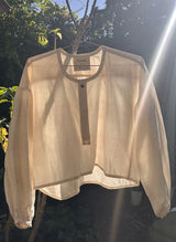An update to the previous Maya top, slightly cropped shirt with a center front placket featuring voluminous sleeves, and a drop armhole. A combination of easy-going with some drama.