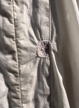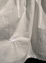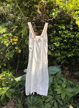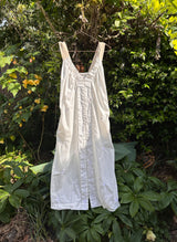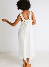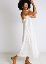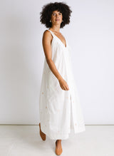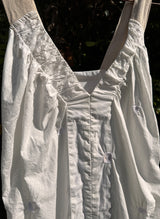 A tank dress with shirring at the V-neck and a front slit featuring wide cotton twill straps that button at the back. Organic white poplin with white embroidered geometric shapes. No lining.