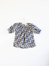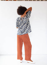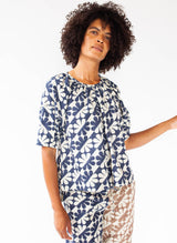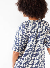 With its loose raglan sleeves, flowy feel, and dahlia hand block print, this top is as joyful as frolicking through fields of florals. Rich with delicate details and unique touches: an asymmetrical hem, ladder trim at the cut seams, stylish gathering at the neckline, and a keyhole button closure.