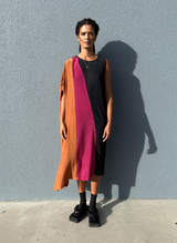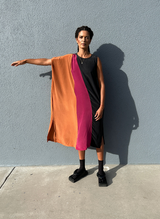 Made of luxe, naturally dyed silk, the Thanh Dress is an asymmetric beauty with a mod flair—sleeveless on one side, with a dramatic color-blocked drape on the other. Features side slits, midi length, and a flowy fit. Our favorite party dress.