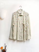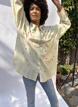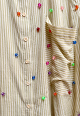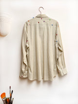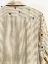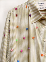 This perfect unisex button down shirt was designed for all. A classical staple with an oversized front pocket and looser fit. This shirt is covered in these special dice beads in colors of the rainbow. The term rolling the dice is a nod to taking a chance in life even though we can’t know the final outcome.