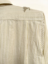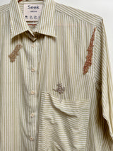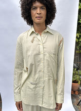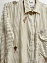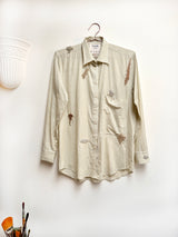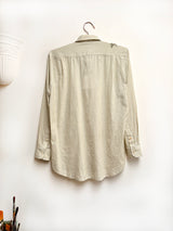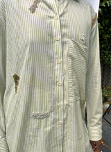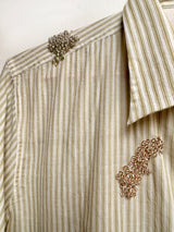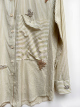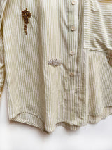 This perfect unisex button down shirt was designed for all. A classical staple with an oversized front pocket and looser fit. This one has abstract shapes reminiscent of an accidental stain or spill but made intentional with silver, gold, bronze and nickel beads. A reminder that there can be happy accidents in life.